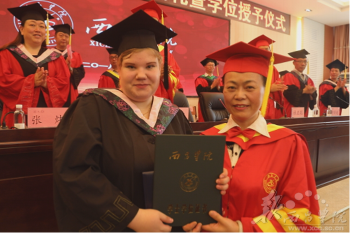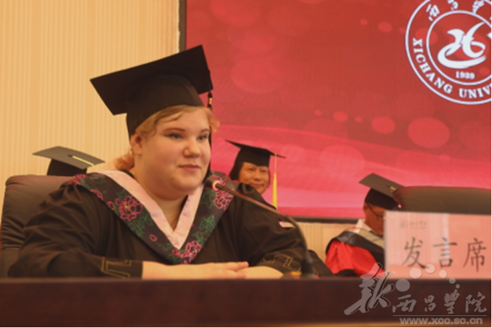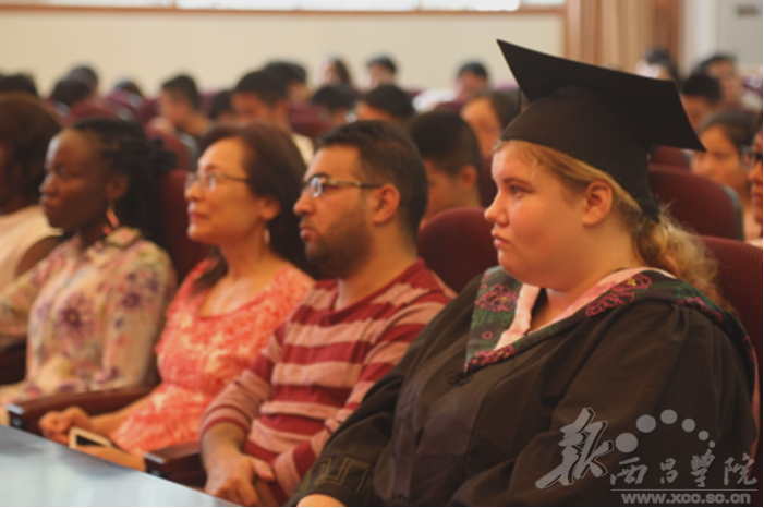 North Campus, July 27, 2018---a commencement was held for Kristina Chernykh, a Russian student of class 2014 majoring in Chinese language and Literature in the library report hall. XCU leaders and international students participated in the ceremony to congratulate Kristina Chernykh on her graduation. Kristina thanked XCU for providing her with a good platform to learn so that she could live and study in a beautiful and friendly place. She also expressed her hope to continue to learn Chinese and promote Chinese Culture after leaving XCU.