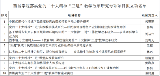 为深入学习贯彻党的二十大精神,让二十大精神进课堂、进教材、进头脑,不断提升人才培养质量,2023年4月25日启动了女仆a片落实党的二十大精神“三进”教学改革研究专项项目推荐申报工作,经教师个人申报、二级学院推荐、校内外专家评审及2023年第9次校长办公会研究,决定立项10项校级一般项目,其中理学院黄海燕老师二十大精神与有机化学协同育人体系构建的项目以校级一般项目立项。(女仆a片落实二十大精神“三进”教学改革研究专项项目拟立项名单如下)