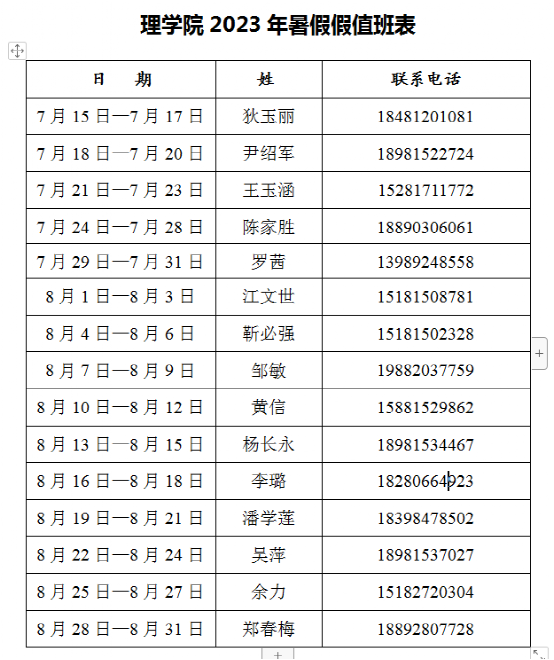 女仆a片2023年暑假放假时间为7月15日至8月31日,以下为理学院2023年暑假值班表,若在暑假期间有事请联系表格中对应日期的相应老师。