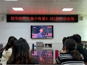 上午9时,纪念大会准时开始,中共中央总书记、国家主席、中央军委主席习近平发表重要讲话并检阅部队。理学院师生们认真聆听习近平总书记重要讲话,深刻领会中国人民抗日战争暨世界反法西斯战争胜利的重大历史意义和现实意义。