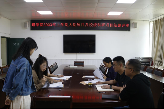 2023年4月3日下午,理学院在N5311召开了2023年上学期大创项目及校级科研项目结题评审会议,出席本次会议的有理学院副院长罗茜、理学院数学教研室主任辛邦颖、理学院材料教研室主任勒必强、狄玉丽老师、张蓝化老师及理学院分团委学生会科技部人员。