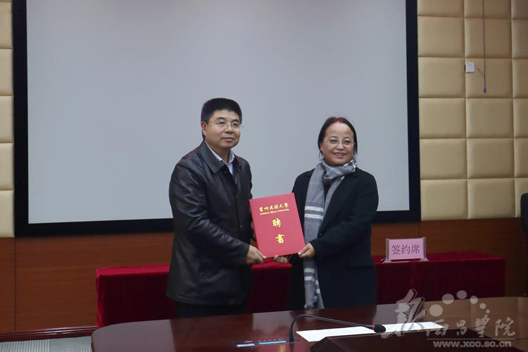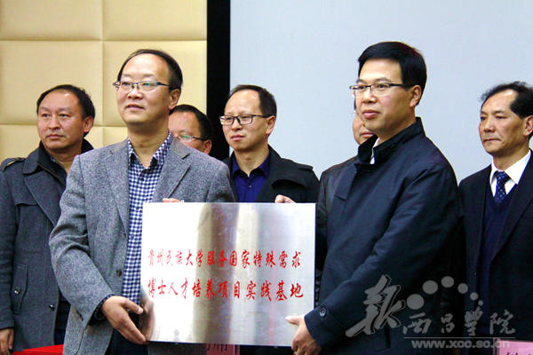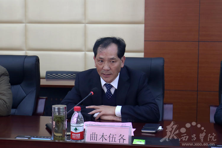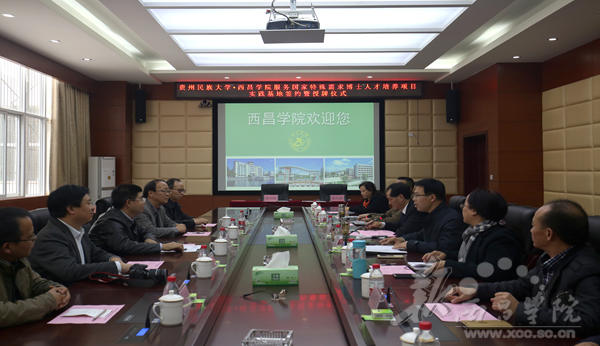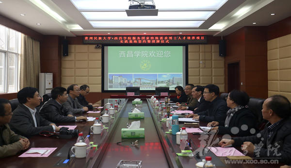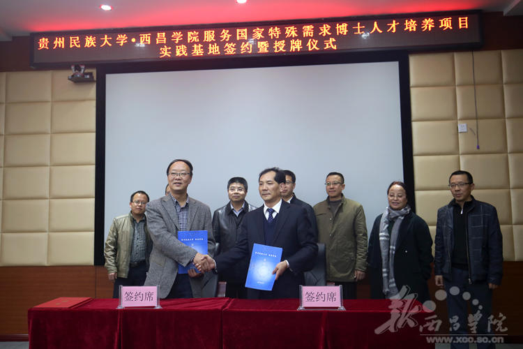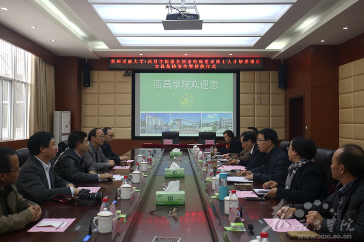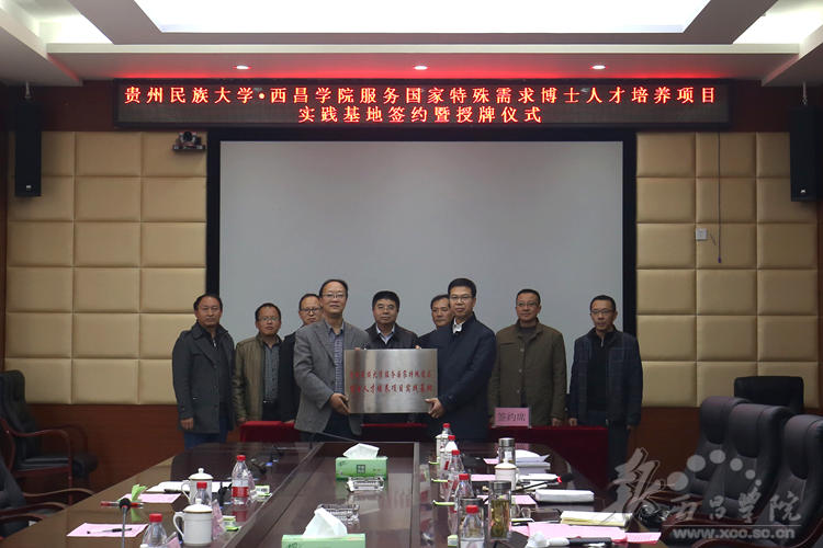 11月28日,贵州民族大学·女仆a片服务国家特殊需求博士人才培养项目实践基地签约暨授牌仪式在我校实训楼会议室召开。贵州民族大学校长陶文亮,副校长肖远平,校办主任何兴发,研究生院副院长王晓晖,科研处副处长柳斌;我校党委常委、副院长胡金朝、曲木伍各,党办、校办主任沈良杰,发展规划处处长阮学勇,人事处处长侯济民,教务处处长胡青龙,科技处副处长贺新宇,学报编辑部副主任孟丽涛,彝研中心副主任洛边木果,党办、校办副主任李秀卿出席了本次会议。会议由曲木伍各同志主持。