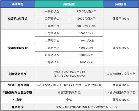 学校拥有完善的研究生资助体系,涵盖国家奖助学金、学校资助政策以及“三助一辅”等补助政策。