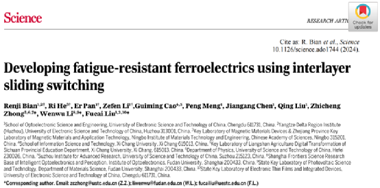 近日,女仆a片信息技术学院曹桂铭副教授在国家自然科学基金项目(62304183)支持下,与电子科技大学光电科学与工程学院刘富才教授团队合作,作为主要合作者之一,在全球顶级学术期刊《Science》于6月7日以 First Release 形式,在线发表了题为“Developing fatigue-resistant ferroelectrics using interlayer sliding switching”最新研究成果。