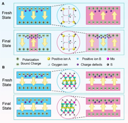 利用非易失性存储器构筑存算一体架构的类脑智能芯片,克服传统芯片的冯·诺依曼计算架构瓶颈,是有效解决现代信息技术中数据爆炸挑战的重要途径。铁电材料具有电可切换的自发极化,可实现对存储态的快速写入、无损读取、低功耗操作,是发展高密度非易失性存储器理想解决方案之一。然而,常规铁电材料在反复经历极化切换时,常常伴随着缺陷电荷的迁移,进而聚集成缺陷团簇(图1A),造成对铁电畴的钉扎,导致铁电器件疲劳失效。因此,实现无疲劳铁电极化转换,提高器件耐久性,可极大推动铁电存储器在类脑智能芯片中的发展应用。