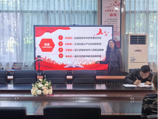为进一步落实党风廉政建设的相关要求,引导教师增强廉洁自律意识,筑牢思想防线,2025年11月7日,信息技术学院党委组织全体教职工党员在致远楼会议室开展了“溯廉洁文化之源 学中央八项规定精神之要义 筑高校师德师风之基”专题党课。此次党课由学院党委副书记、院长曾陈萍主讲,旨在引导广大党员教师从中华优秀传统文化中汲取廉洁养分,深刻领会中央八项规定精神的核心要义,筑牢新时代高校师德师风建设的思想根基。