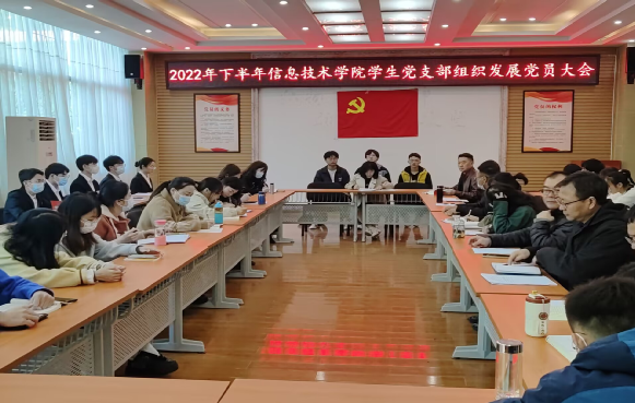 学习二十大,永远跟党走,奋进新征程。为了壮大党员队伍,全面提升党员发展质量,把先进优秀青年聚集在党的旗帜下,为实现中华民族伟大复兴而共同奋斗。信息技术学院学生党支部于2022年11月28日中午12:30在致远楼一楼会议室,开展了2022年下半年拟发展党员支部讨论大会。