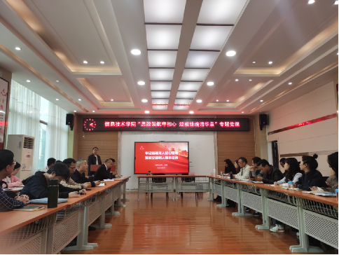 为深入学习贯彻党的二十大精神,全面落实新时代党的教育方针和《教育强国建设规划纲要(2024—2035年)》,按照学校统一安排部署,信息技术学院党委于2025年3月27日在致远楼会议室开展了“牢记铸魂育人初心使命 落实立德树人根本任务”专题联学党课,党课由马克思主义学院的田茂鑫老师主讲,马克思主义学院蔡敏春老师参加。本次党课由信息技术学院党委书记谭时康主持,学院全体教职工、学生党员参与专题党课学习。