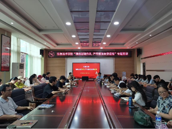 为推进作风建设,筑牢廉洁防线,信息技术学院党委于2025年7月3日在致远楼一楼会议室开展了“锤炼过硬作风、严守廉洁自律底线”专题党课。党课由学院党委书记谭时康主讲,全体师生党员参加。