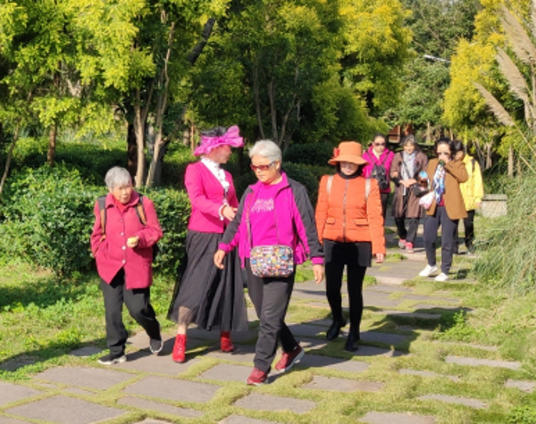 (离退休职工健步走) 阳光明媚,微风正好,带着一丝秋天的凉意,活动开始后,各位离退休老教师们三三两两,漫步在湿地、校园中,一边欣赏着湿地、校园初秋的美景,一边交流着近期家庭、生活等变化及疫情防护和身体保健等知识。一路欢声笑语,为此次重阳节活动增添了别样的精彩。 |