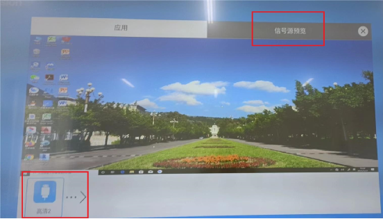 如果墙上大屏信号与电脑显示不一致,则在大屏上点击“系统设置”,“信号源预览”选择“高清HDMI2”,如下图所示。