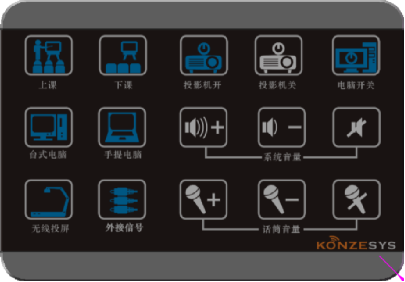 按下控制面板左上角的“上课”按键1~2秒(如下图所示),然后电脑、投影机和扩声设备等将逐步自动开启。