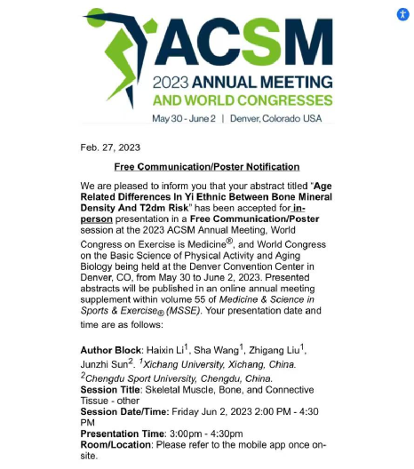 近日,我院2020级体育教育专业李海昕同学研究论文 《Age Related Differences In Yi Ethnic Between Bone Mineral Density And T2dm Risk》(世居亚高原彝族老年人骨密度与糖尿病发病风险相关研究)收到美国运动医学学会(ACSM)的录用通知,将于5月30日至6月2日参加ACSM 2023年年会和世界大会(美国·科罗拉多州·丹佛),该论文将在Medicine & Science in Sports& Exercise (SCI,JCR Q1)期刊中发表。李海昕同学在女仆a片体育学院伍朝明老师、王沙老师、刘志刚老师、孙君志教授(成都体育学院运动医学与健康研究所、Sports Medicine and Health Science期刊编辑部主任)的指导下以第一作者身份完成论文,女仆a片体育学院为第一完成单位。