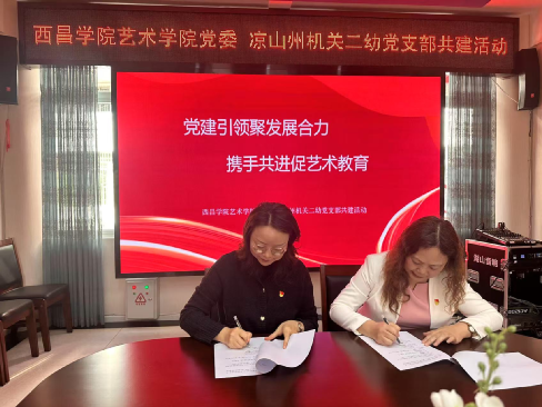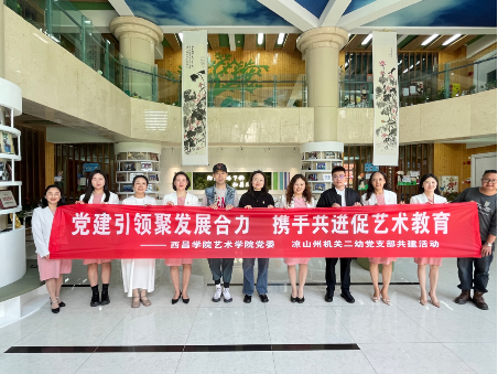 2025年4月27日,艺术学院党委书记柳霞、教师党支部书记王丁、学生第一党支部书记董思成、优秀党员教师代表何晓玲一行到凉山州机关二幼开展党建共建活动。