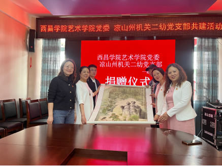 活动最后,我院教师党支部优秀党员教师何晓玲向州二幼捐赠个人书画作品《彝海结盟》,韩红代表州二幼全体师生表示感谢。