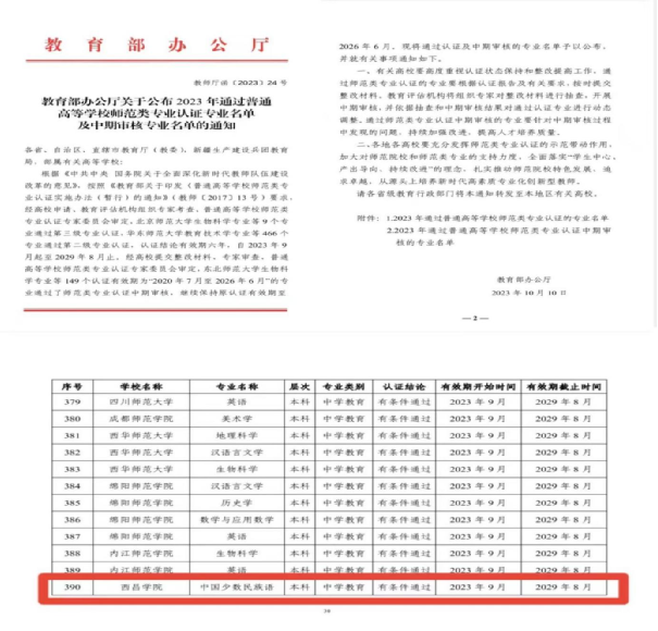 近日,根据教育部办公厅发布的《2023年通过普通高等学校师范类专业认证专业名单及中期审核专业名单的通知》(教师厅函〔2023〕24号),彝语言文化学院中国少数民族语言文学专业通过了中学教育第二级认证,认证结论有效期六年(2023年9月-2029年8月),该专业也是女仆a片首批申请并率先通过教育部师范类专业二级认证的专业。