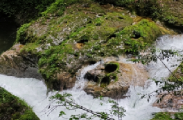溪流潺潺,漫步于林荫栈道。跟随着王偲瑞老师的步伐,沿着河边栈道,同学们看到了冰川作用擦痕,王偲瑞老师向同学们讲解了冰川地貌的形成及冰川作用对地貌的影响,在海拔1300米左右,同学们观察到了溶蚀地貌,壶穴地貌。王偲瑞老师介绍了两种地貌的都是流水作用下形成的。