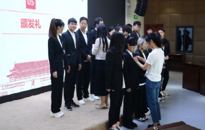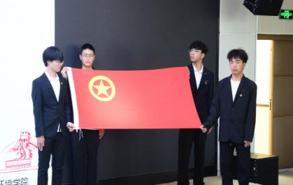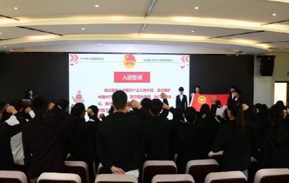其次主持人宣布了新团员名单,团歌的声音响起,工作人员举着团旗入场,清源和姜英上台为新团员佩戴团徽,而后,分团委学生副书记邱凤带领新团员宣誓,入团誓词是一份铿锵有力、铭刻初心的政治誓言、郑重承诺,让各位团员时刻铭记入团初心,坚定共产主义远大理想和中国特色社会主义共同理想,将誓词镌刻在心里、落实到行动上。通过这些流程让新团员感受到了入团的“仪式感”,了解团史,热爱中国共产主义团,让全体团员了解胸前团徽的来之不易,要爱惜它为它增光添彩也让老团员重温入团时刻,感受共青团的伟大,更深入地了解了共青团的任务,明白了共青团员身上肩负的责任和使命,并立志为更好地完成任务而奋斗,做好党的后备军。
