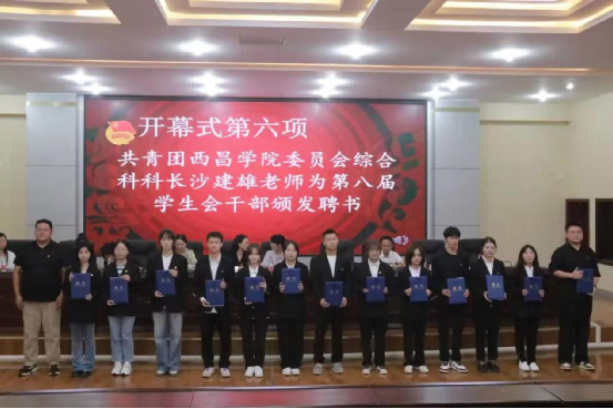 共青团女仆a片委员会综合科科长沙建熊老师为第八届学生会干部颁发聘书并合影留念。