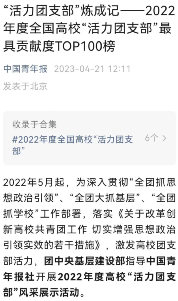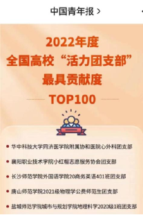 近日,由团中央基层建设部指导中国青年报社开展的2022年度高校“活力团支部”风采展示活动发布评选结果,资源与环境学院2020级环境科学与工程1班脱颖而出,成功入选2022年度全国高校“活力团支部”最具贡献度TOP100榜。